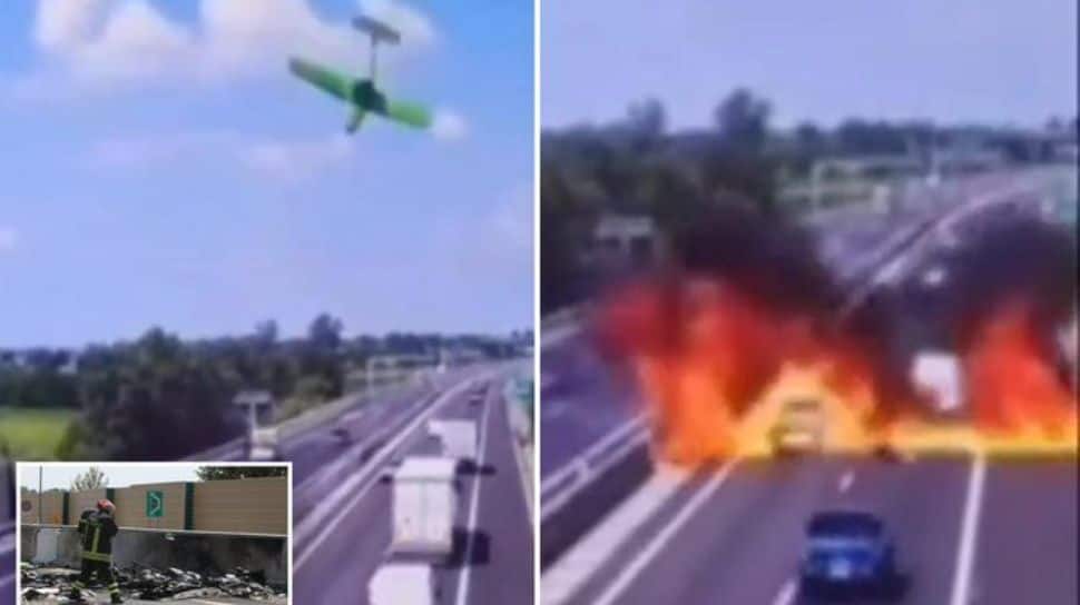Small aircraft crashes onto Italian highway, igniting wall of fire. Two people on board, a 75-year-old man and a 60-year-old woman, killed. Cause of crash unknown.pic.twitter.com/ybdZiY9WPc