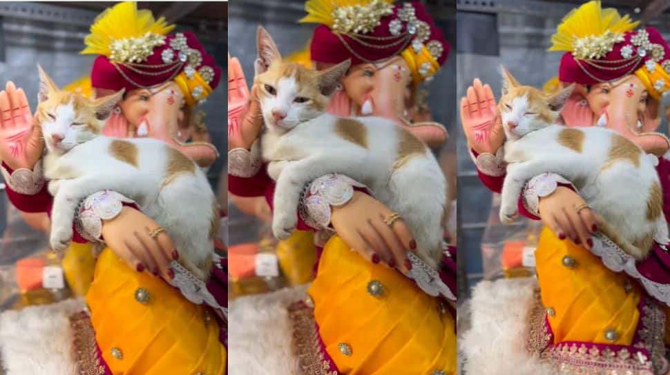 The viral clip shows the cat calmly sleeping on the arm of a Lord Ganesha idol. Completely relaxed, it seems to have found the safest and coziest spot.