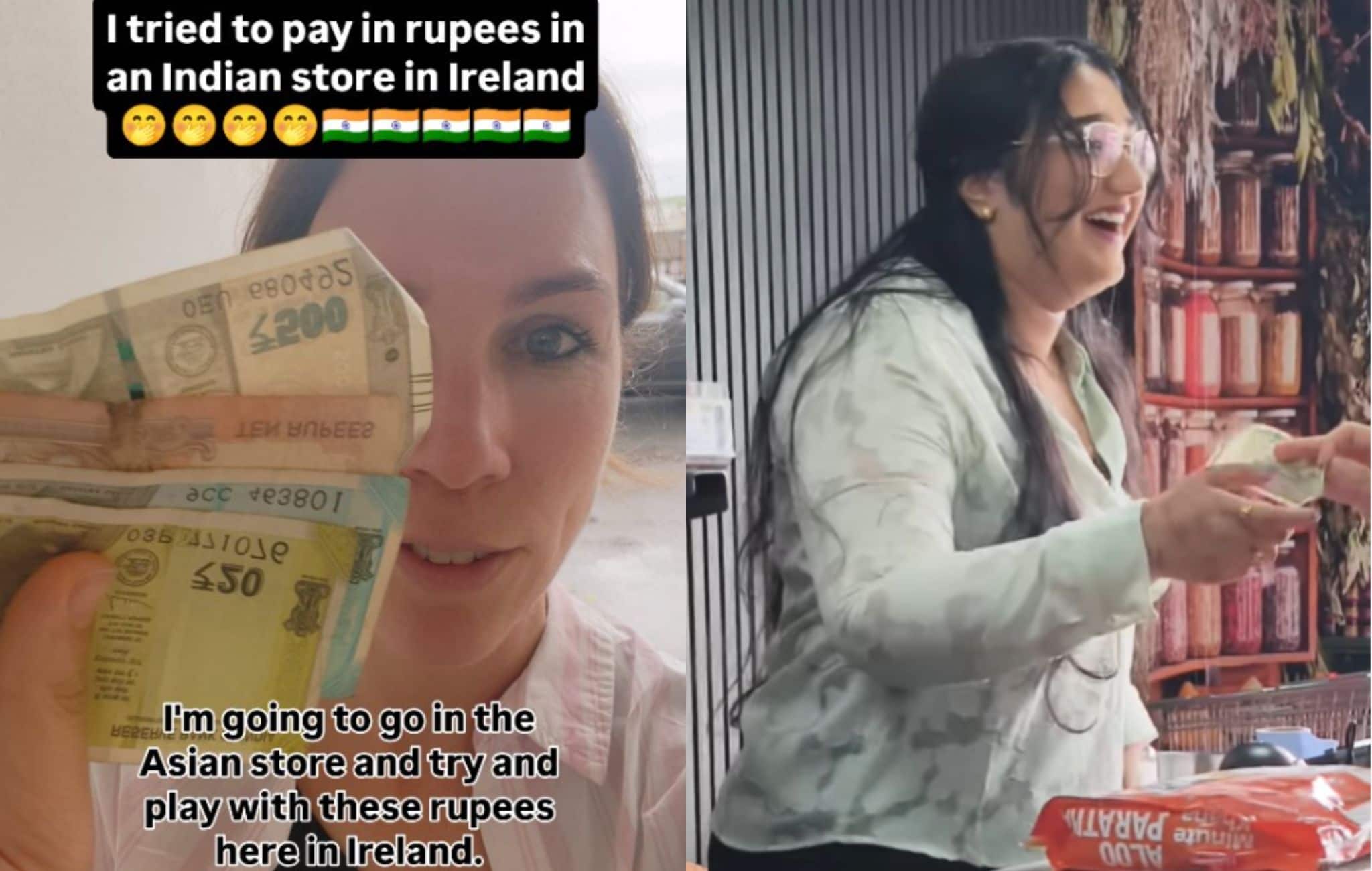 She walked into the shop, picked up a few items, and went to the billing counter. Instead of euros, she placed the Indian notes on the desk. The clip had the caption, “Tried paying in rupees at an Indian store in Ireland.”